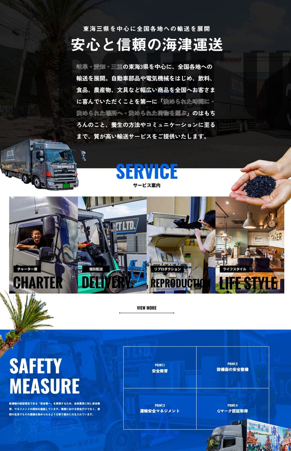 海津運送様の「らしさ」が最大限伝わる雰囲気と、求職者に「ここで働きたい」と思ってもらえる情報設計で作り上げたコーポレートサイトです。