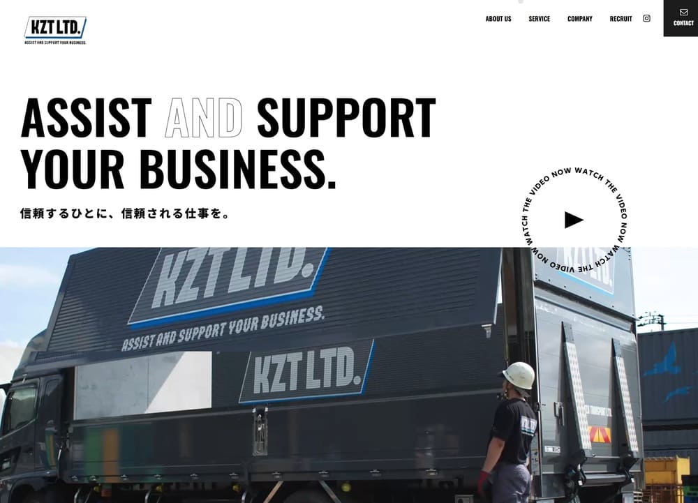 ファーストビューでは、業種説明を前に出しすぎず、英字コピーや動画を用いて、海津運送様ならではの空気感を先に伝えています。