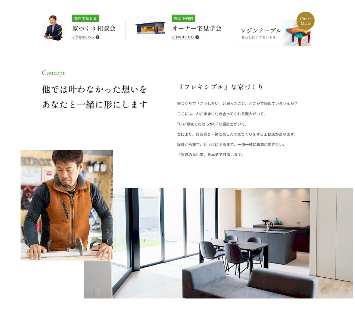 「建築の途中でも、理想に合わせて柔軟に対応する」というヒロ建築工房様の泥臭いまでの誠実さを、サイトの核として位置づけました。